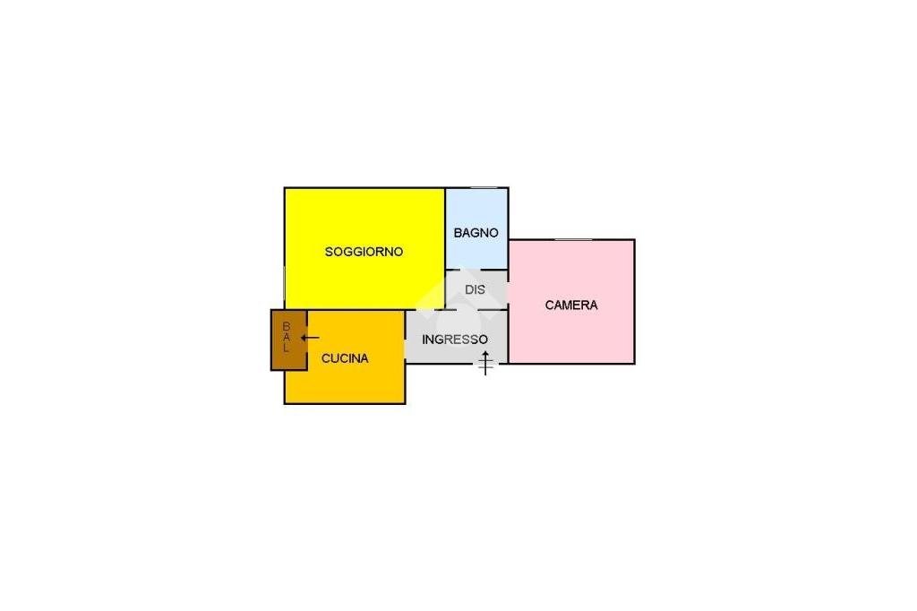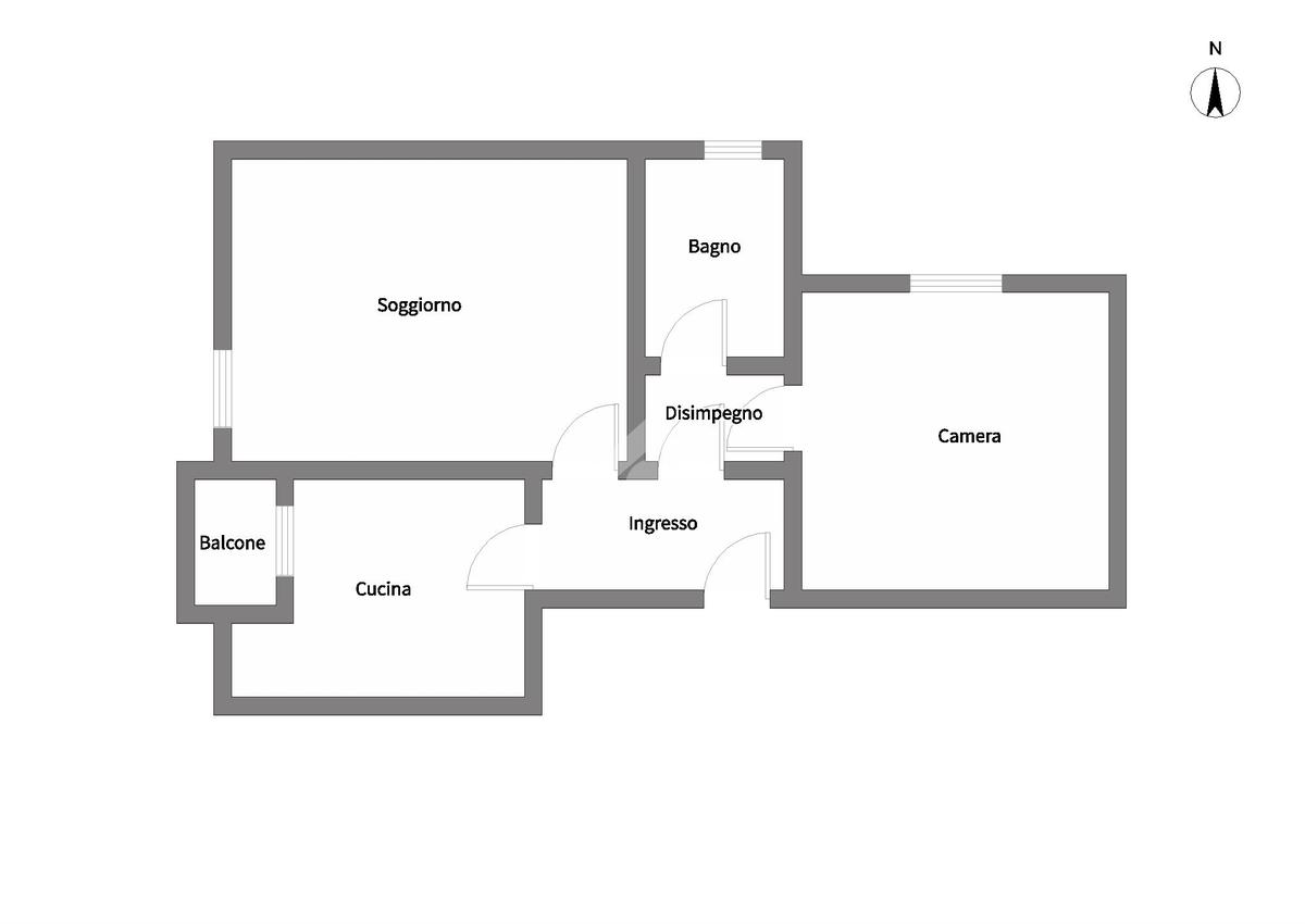 L'appartamento si apre su un ingresso con disimpegno, una zona giorno con salone e cucina abitabile con accesso al balcone, e una zona notte composta da camera matrimoniale e bagno con finestra.