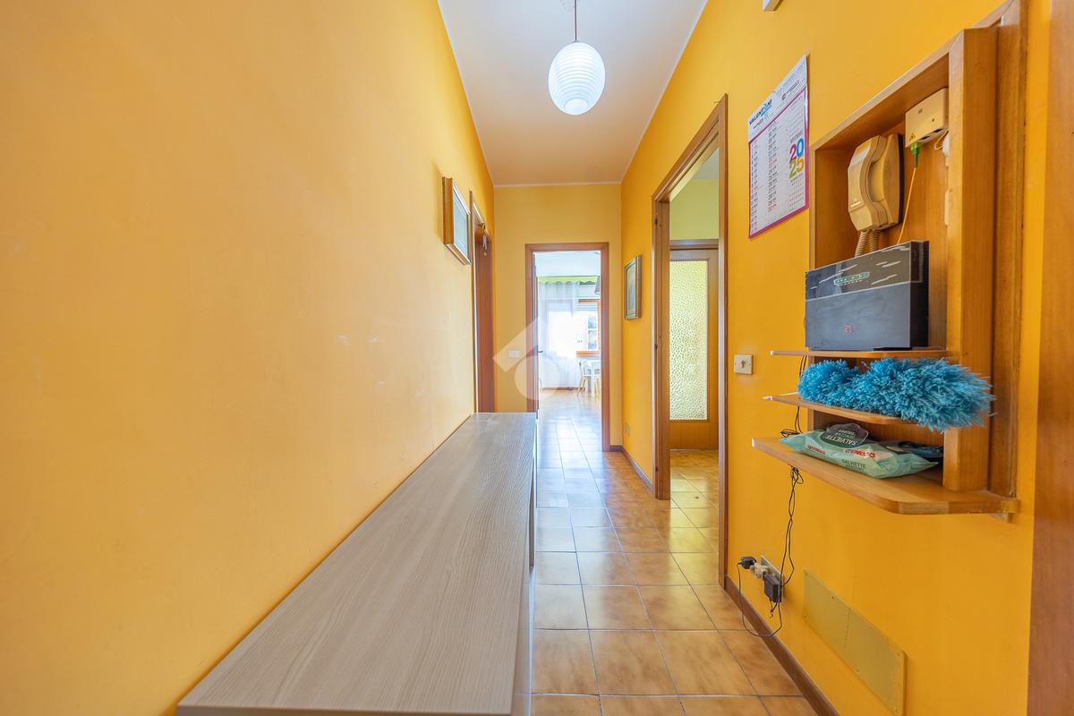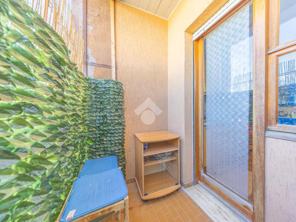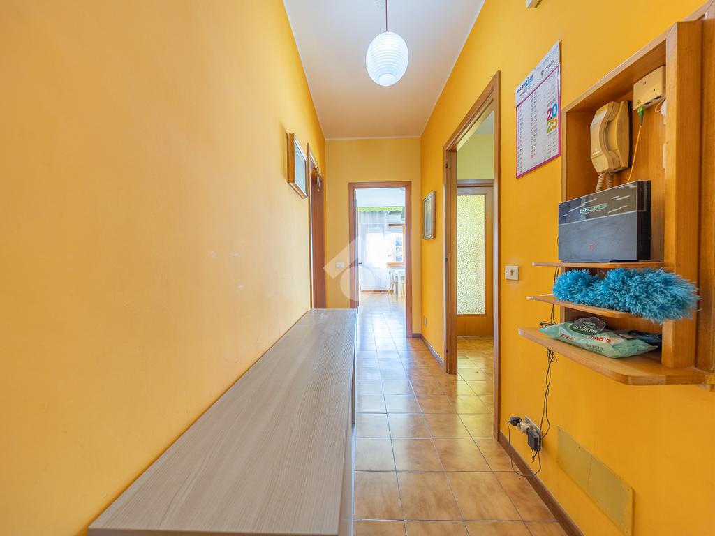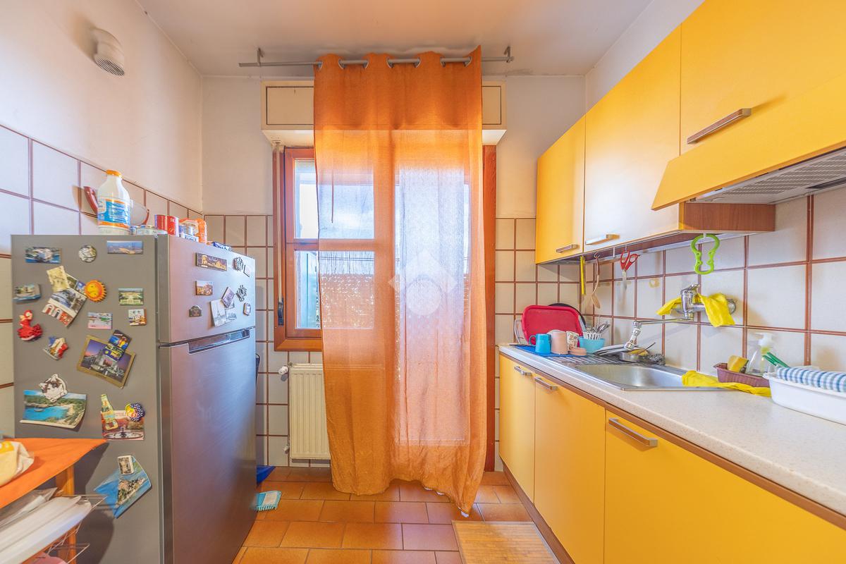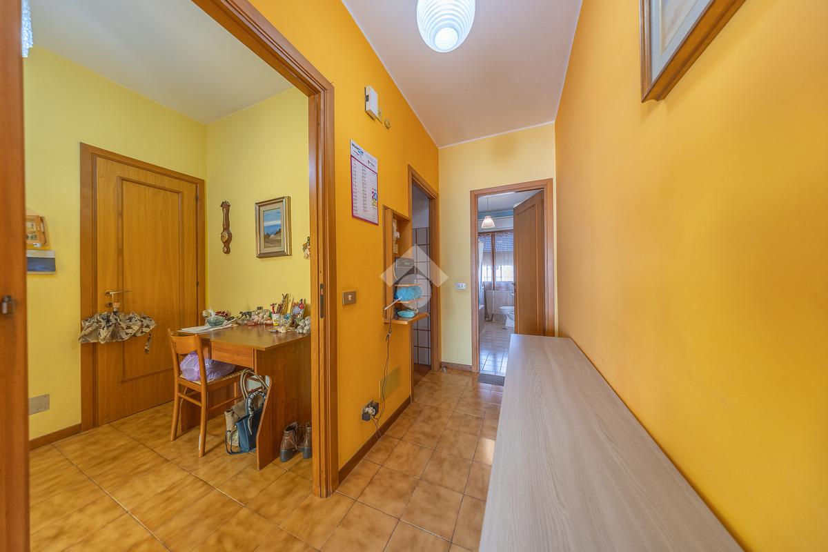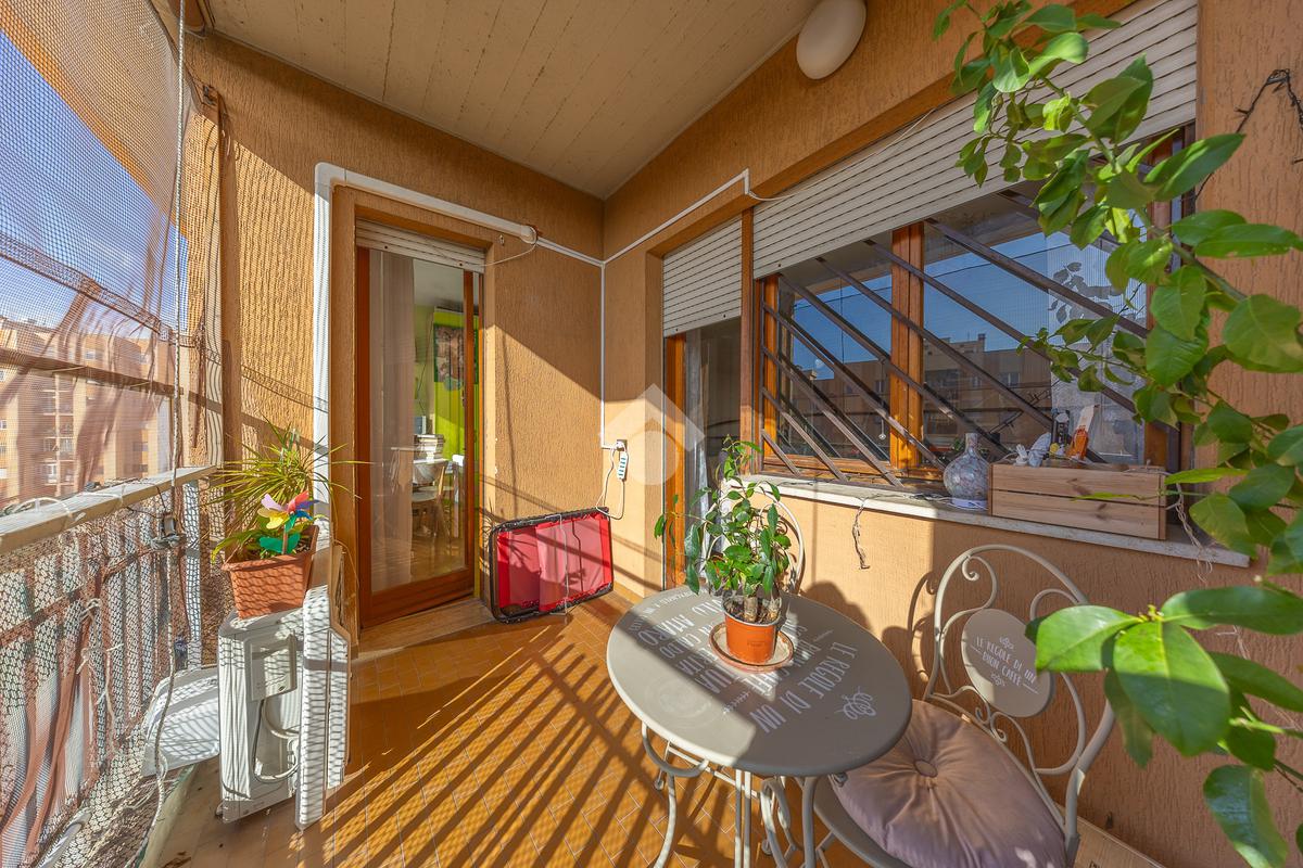 L’ingresso con disimpegno introduce alla cucina abitabile con balcone e al soggiorno, dotato di accesso diretto al terrazzino.
