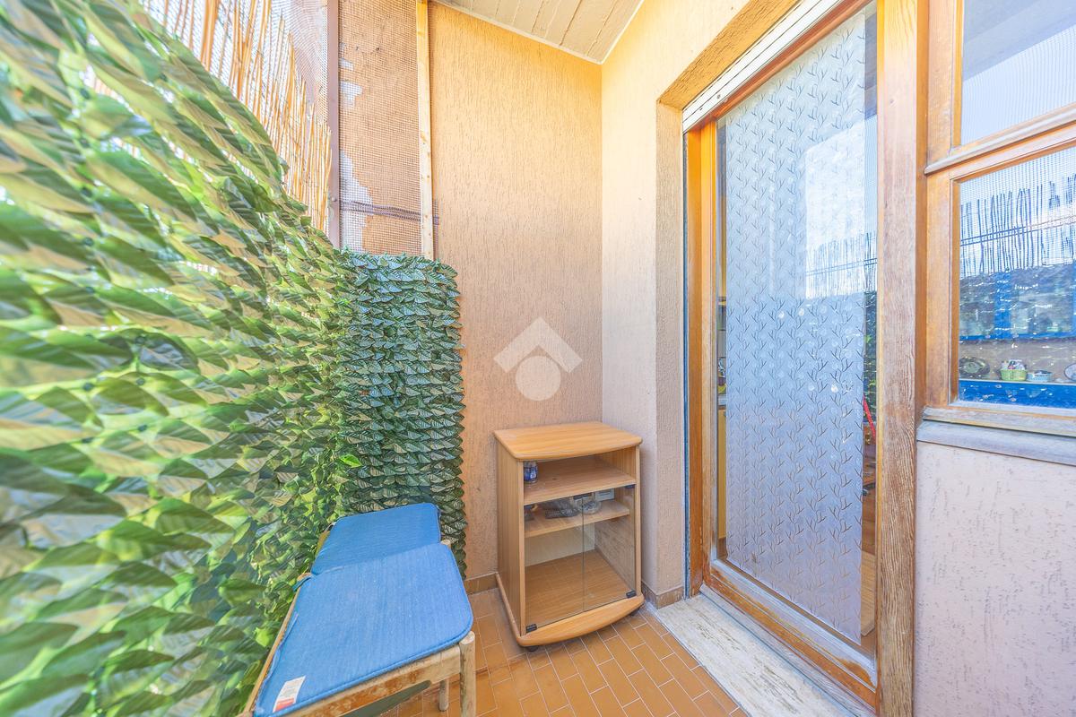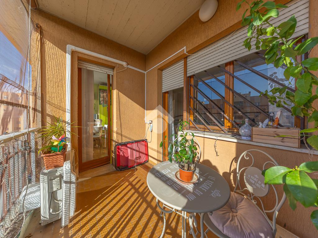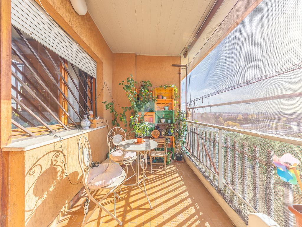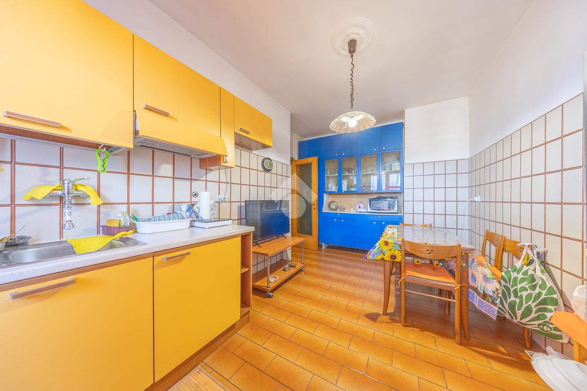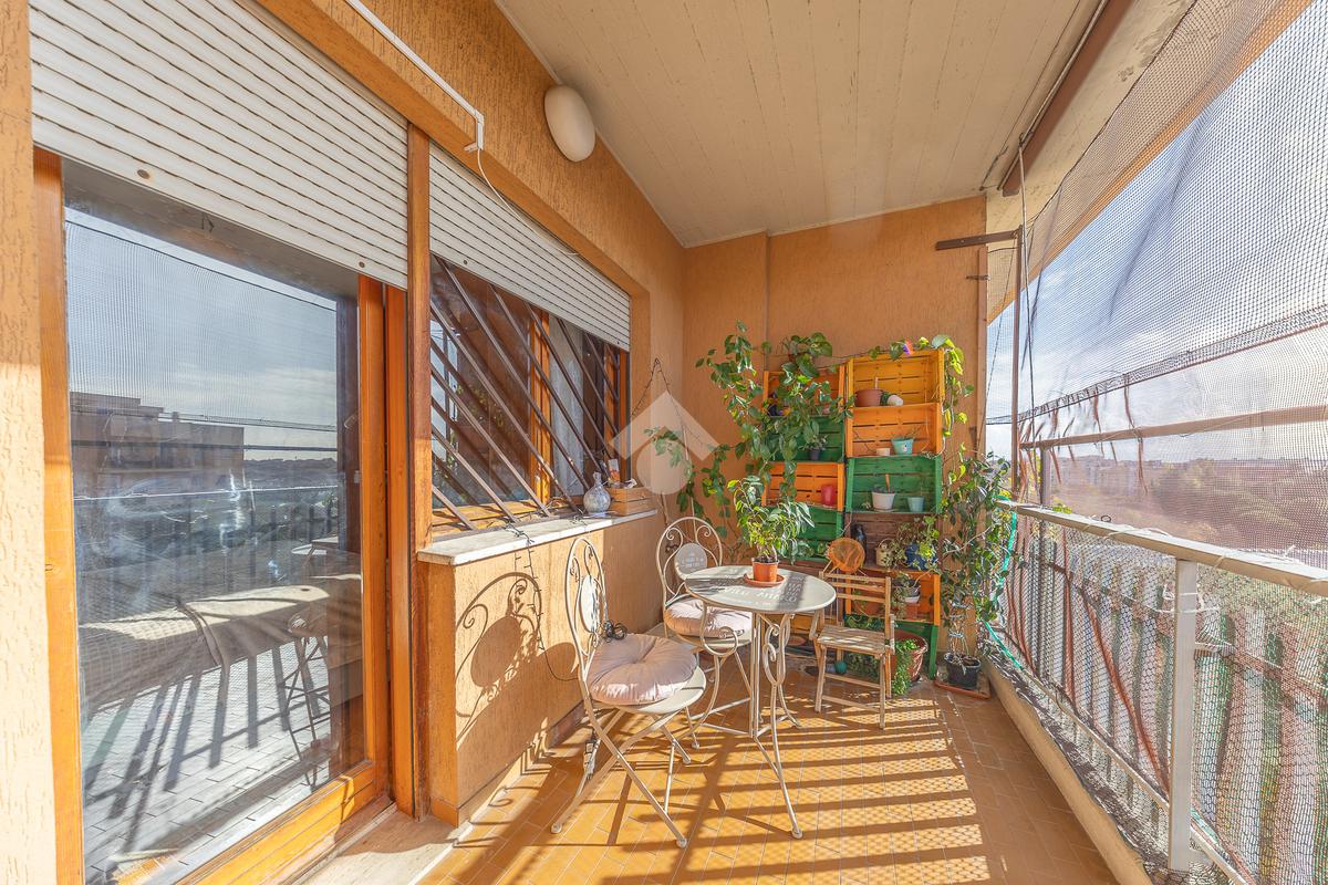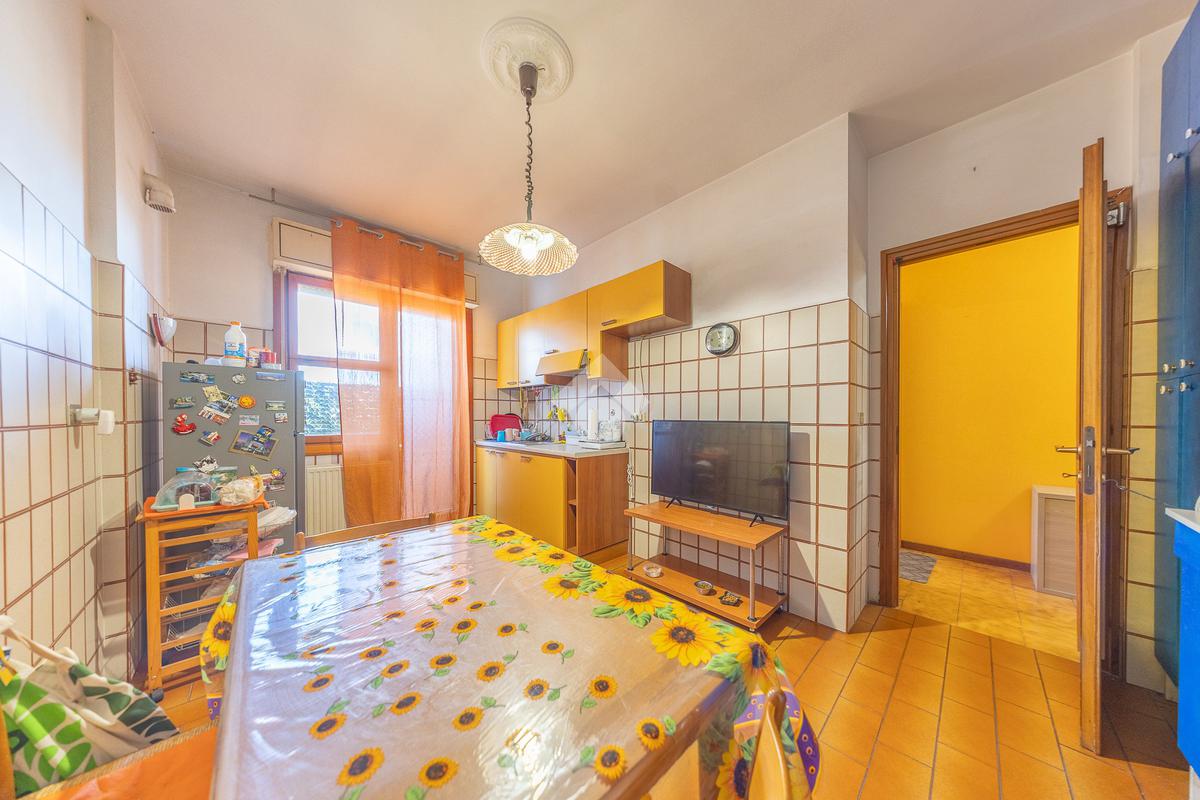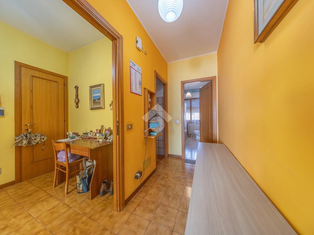 L’ingresso con disimpegno introduce alla cucina abitabile con balcone e al soggiorno, dotato di accesso diretto al terrazzino.