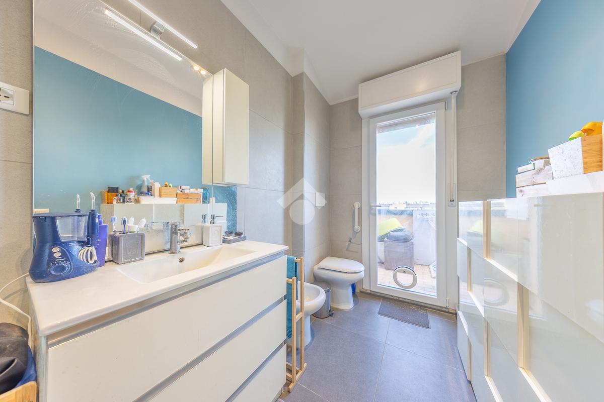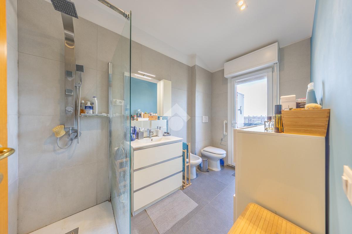 All’ottavo e ultimo piano proponiamo un bilocale di 51 mq completamente ristrutturato nel 2020, apprezzabile per l’elevata luminosità garantita dal piano alto, dalla doppia esposizione est/ovest e dall’affaccio aperto sul parco. È una zona strategica, ricca di autobus, per raggiungere la Metro B e FL1.