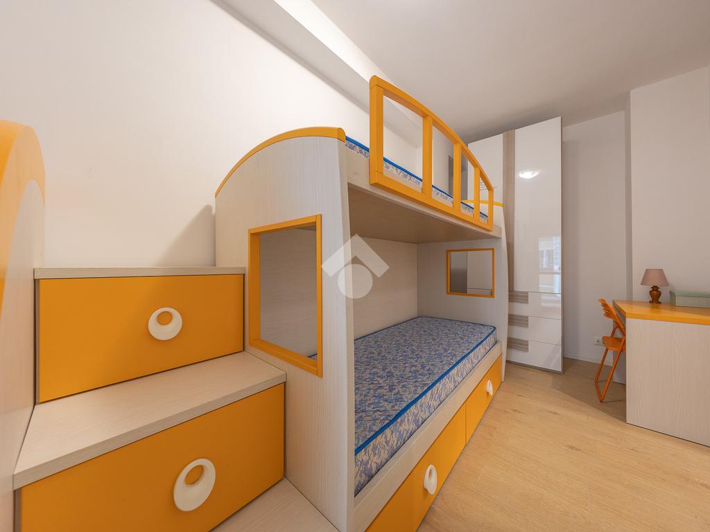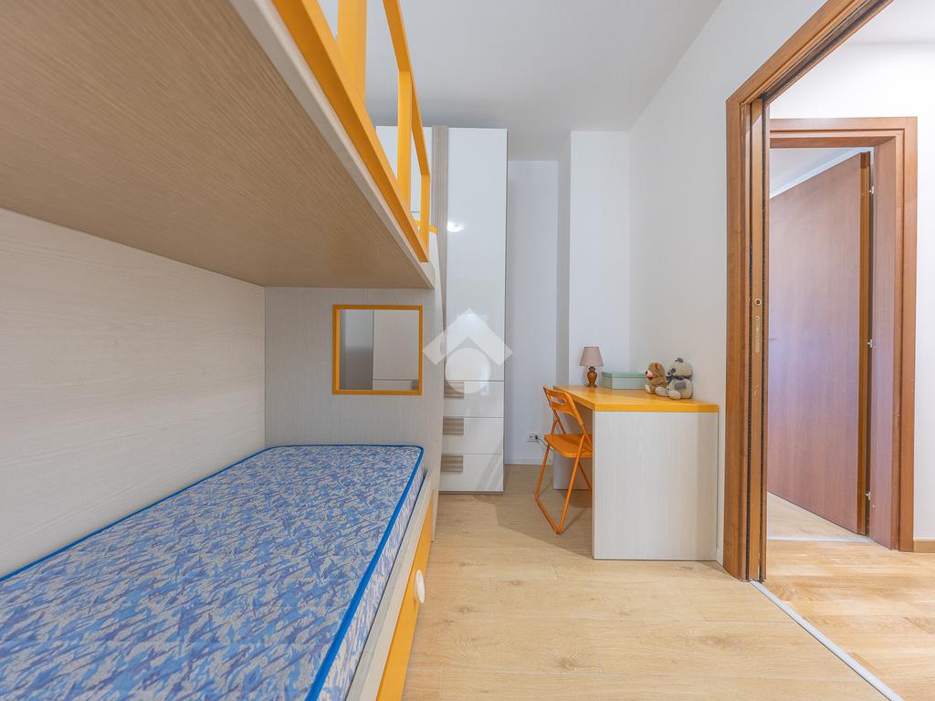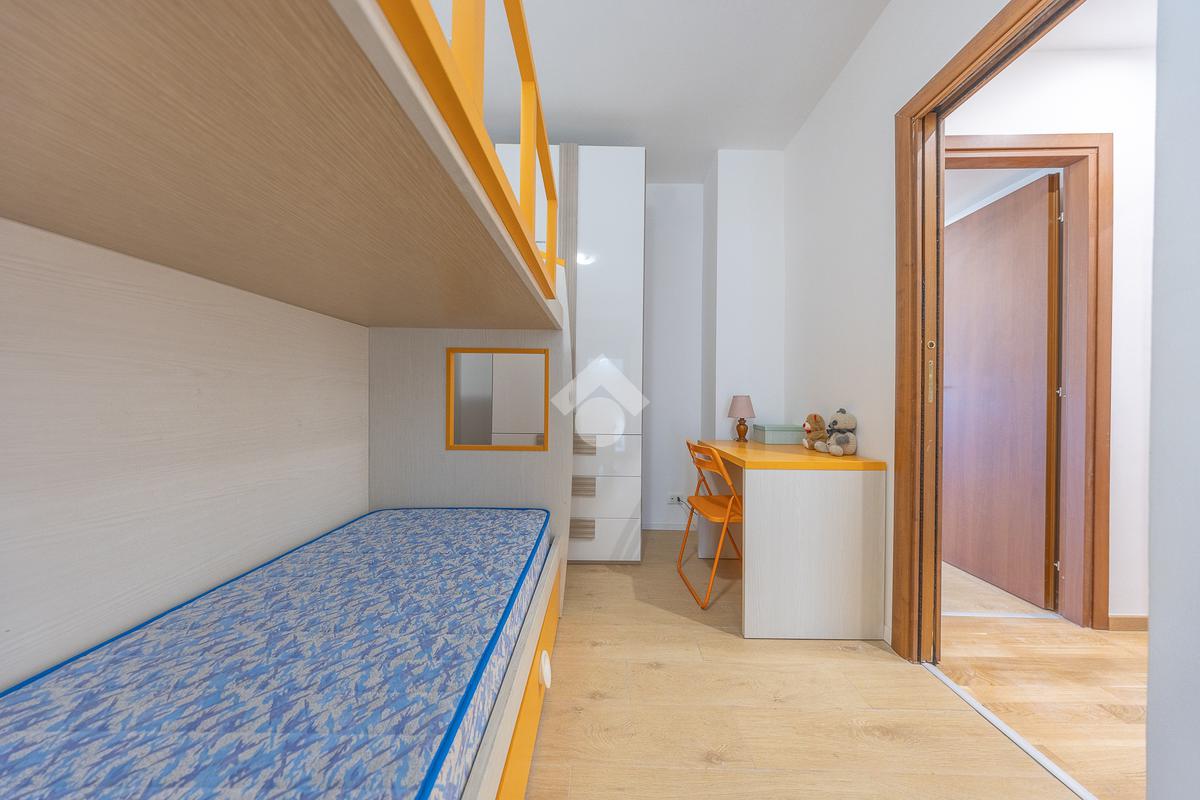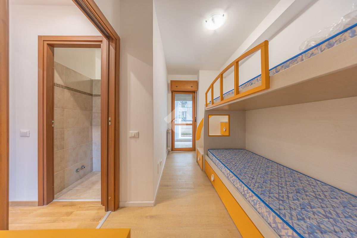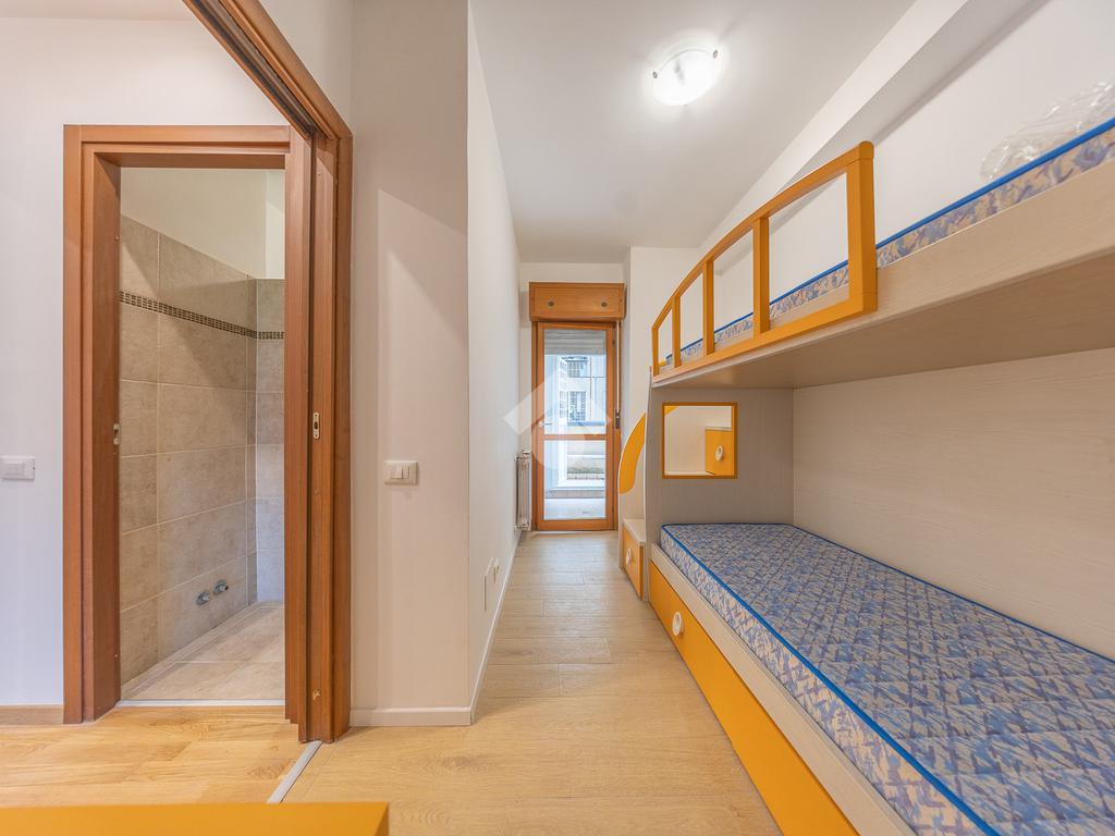 tramite disimpegno si accede alla camera matrimoniale, alla cameretta con uscita sul balcone e al bagno finestrato con box doccia.