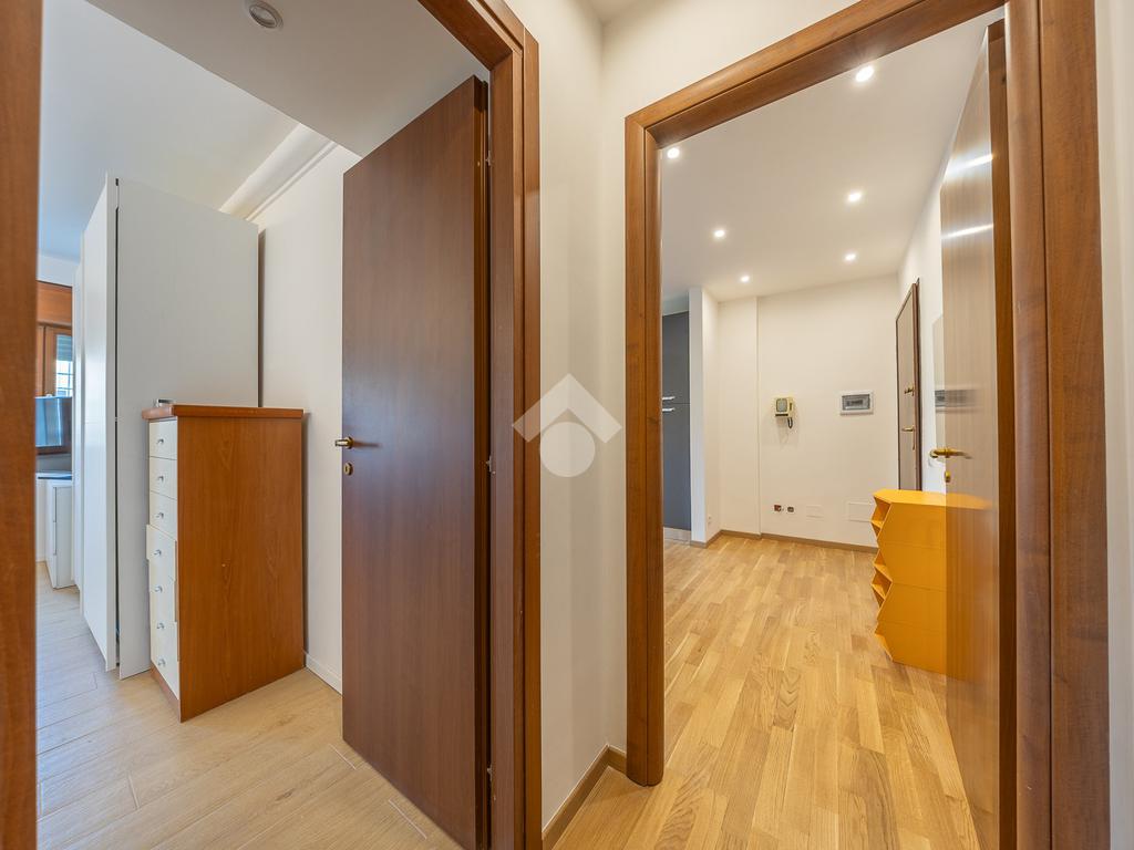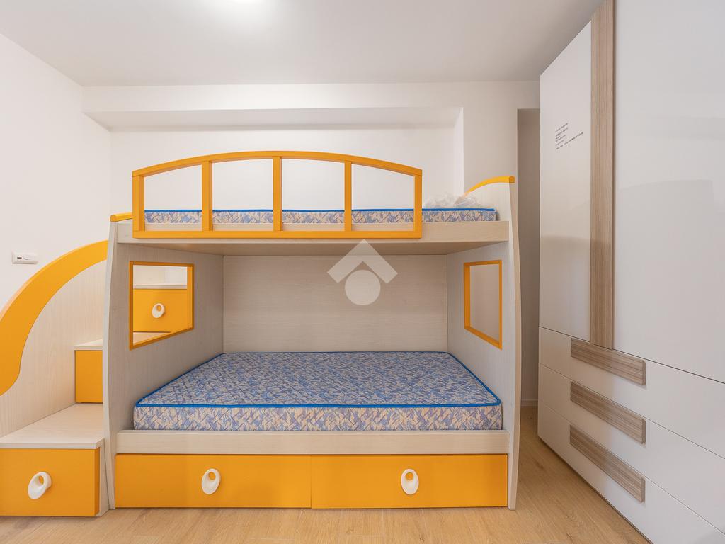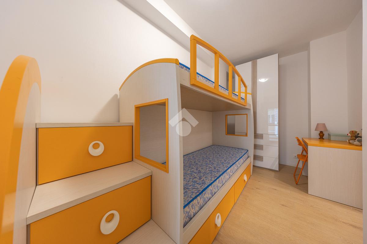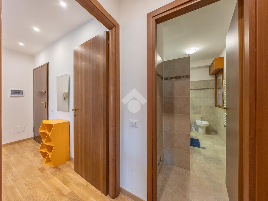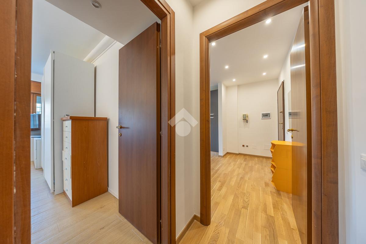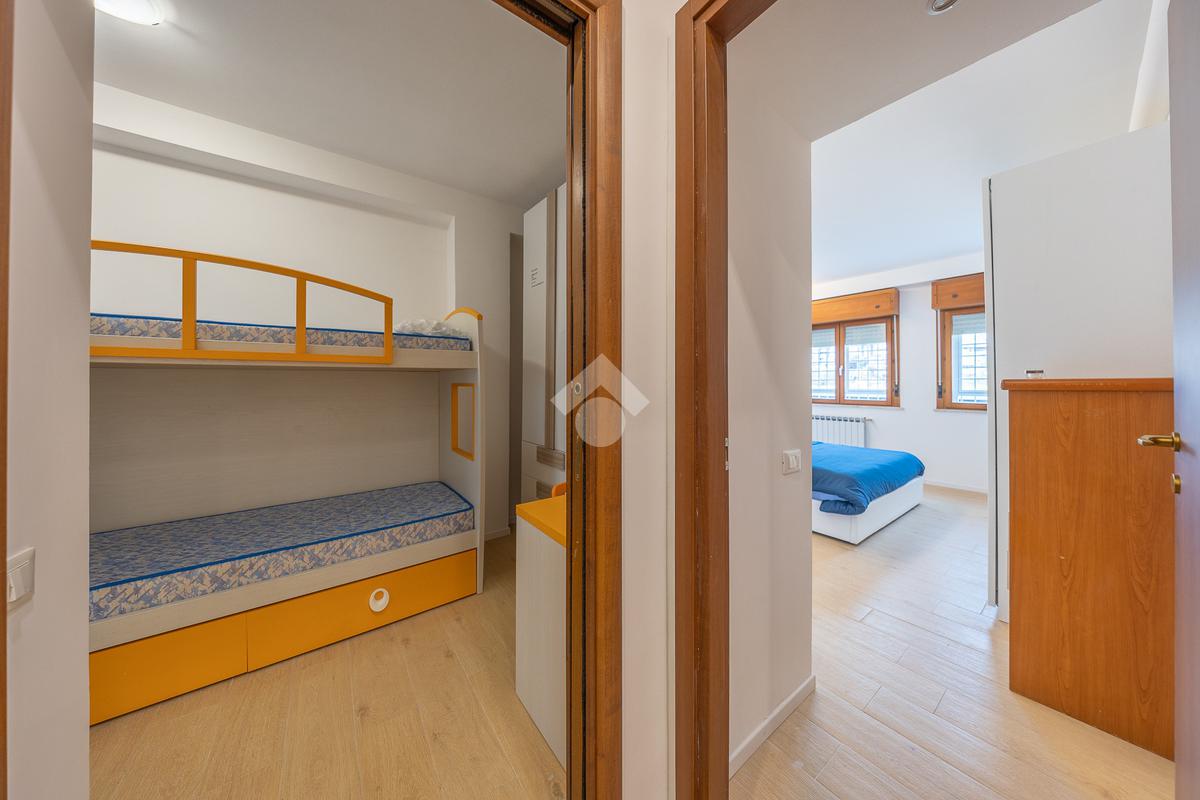 tramite disimpegno si accede alla camera matrimoniale, alla cameretta con uscita sul balcone e al bagno finestrato con box doccia.