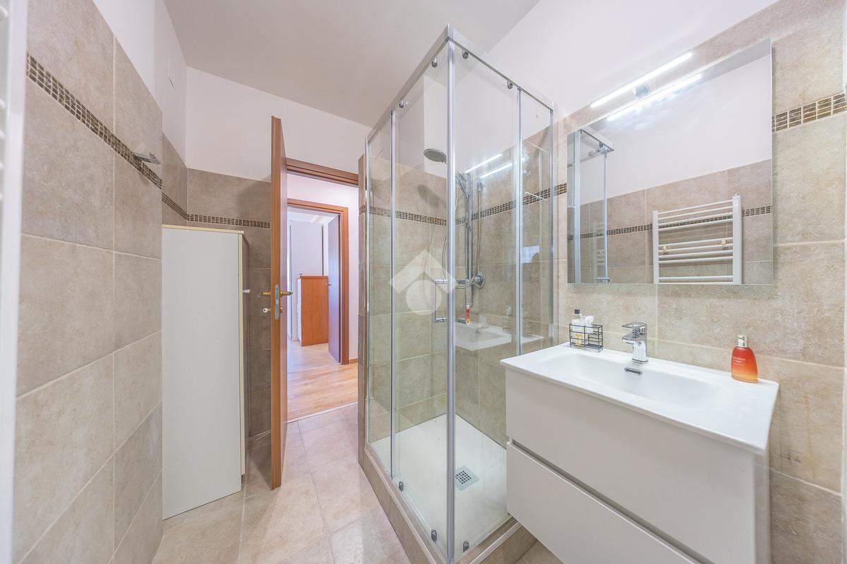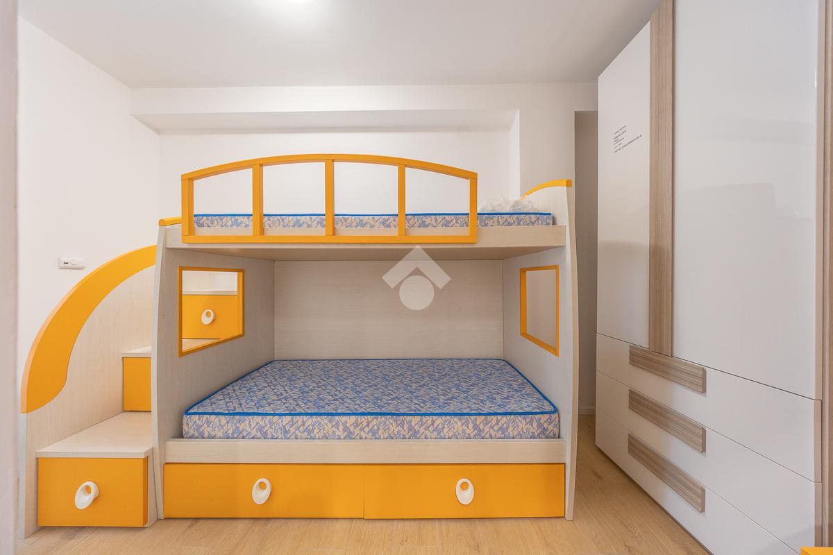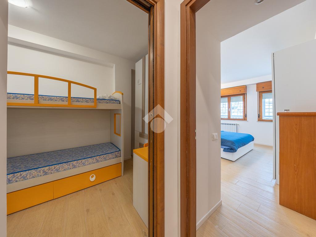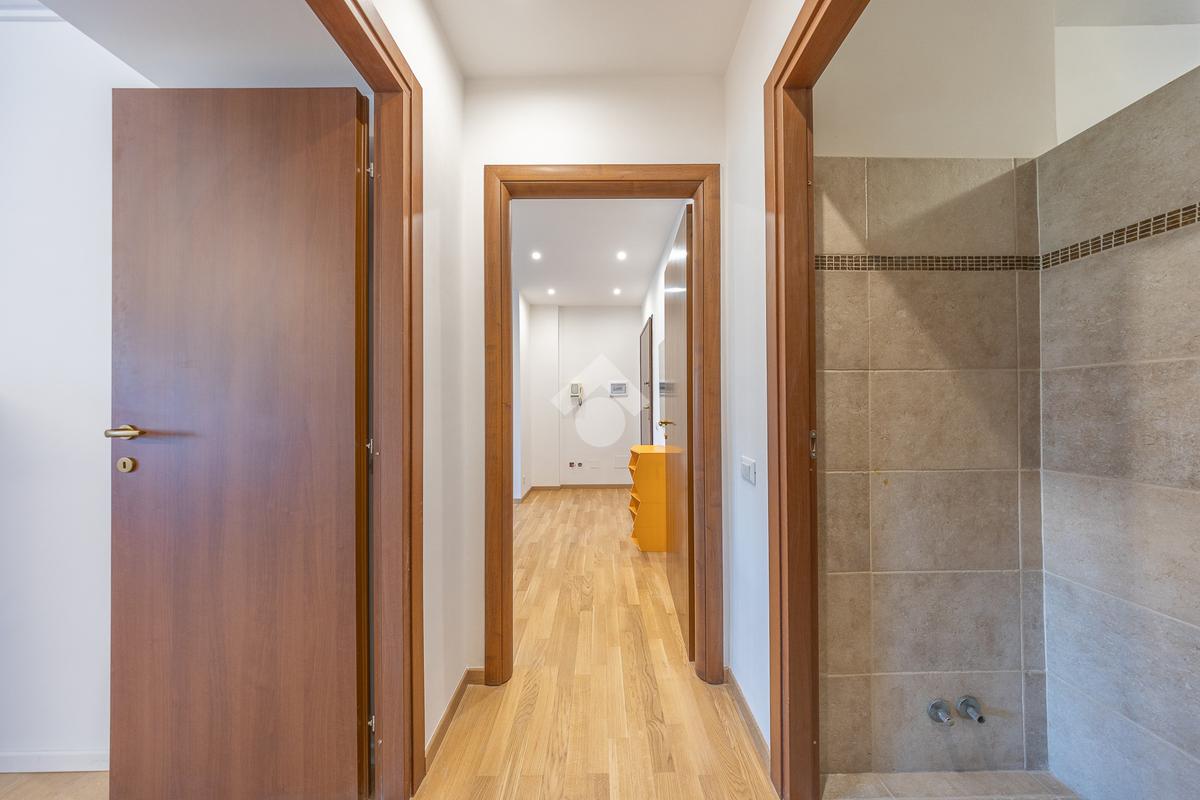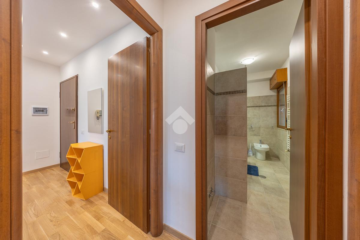 tramite disimpegno si accede alla camera matrimoniale, alla cameretta con uscita sul balcone e al bagno finestrato con box doccia.