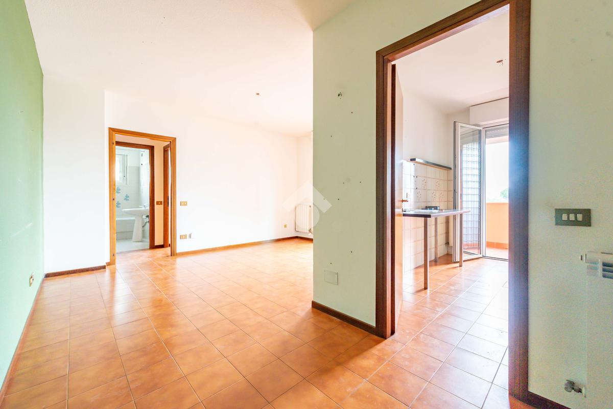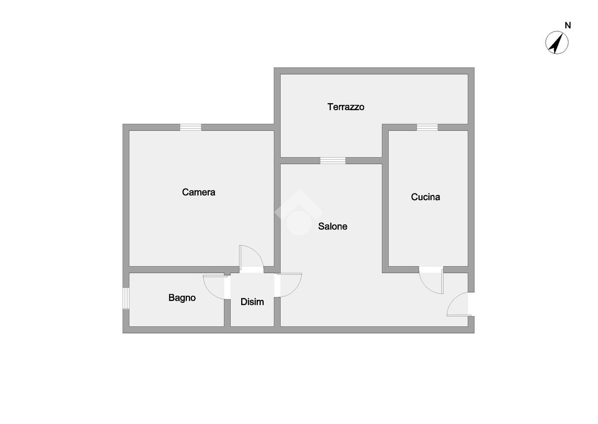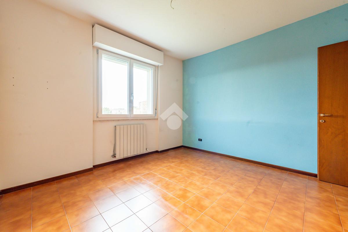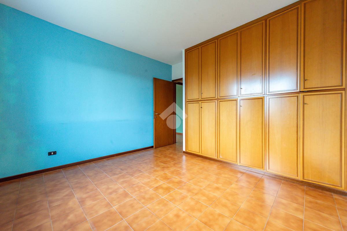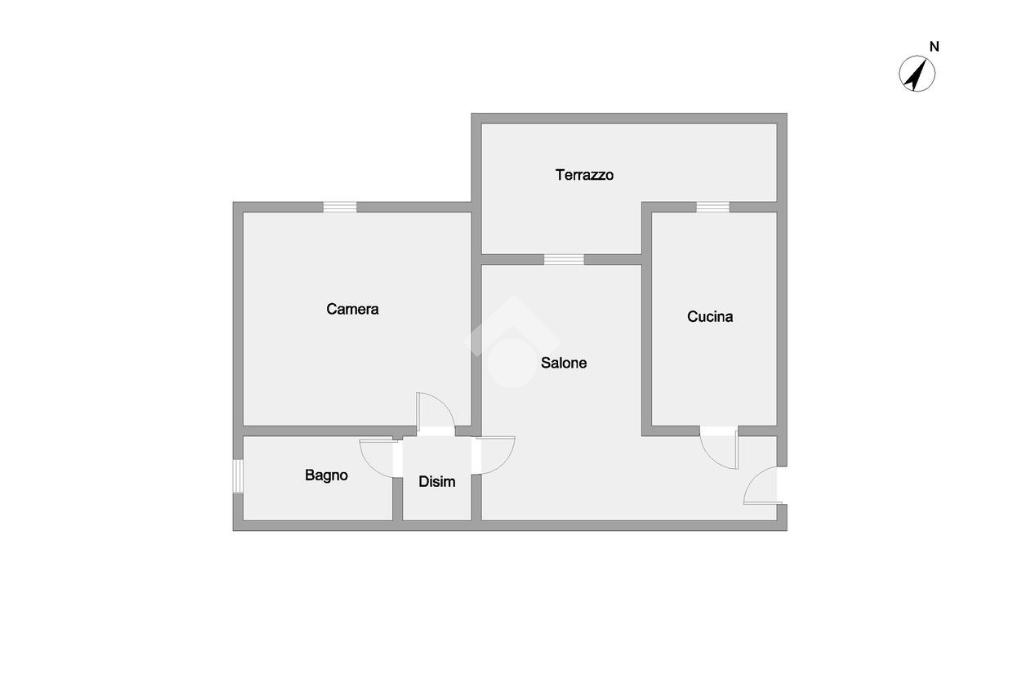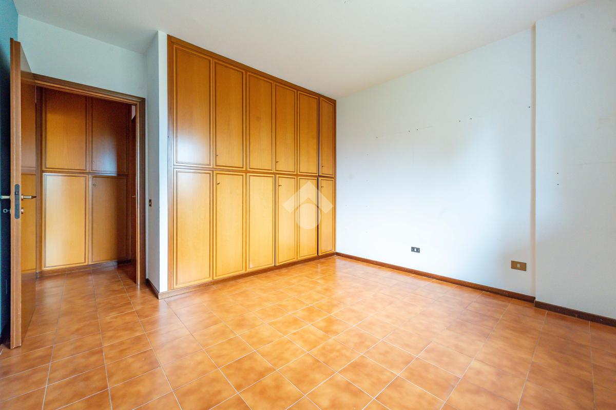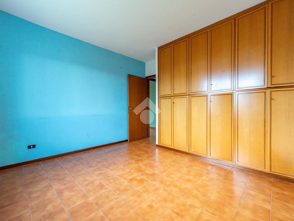 La zona notte, ben separata da un pratico disimpegno, comprende una camera matrimoniale e un bagno finestrato con box doccia. La presenza di armadi a muro sia nella camera che nel disimpegno garantisce ulteriore spazio contenitivo.