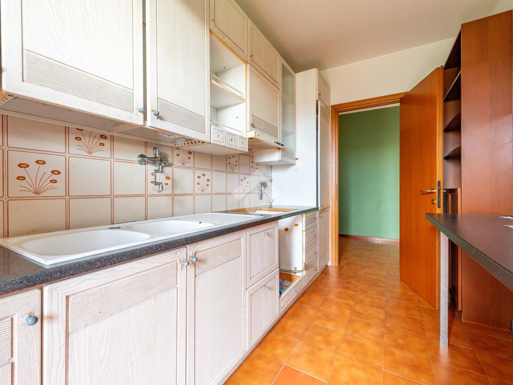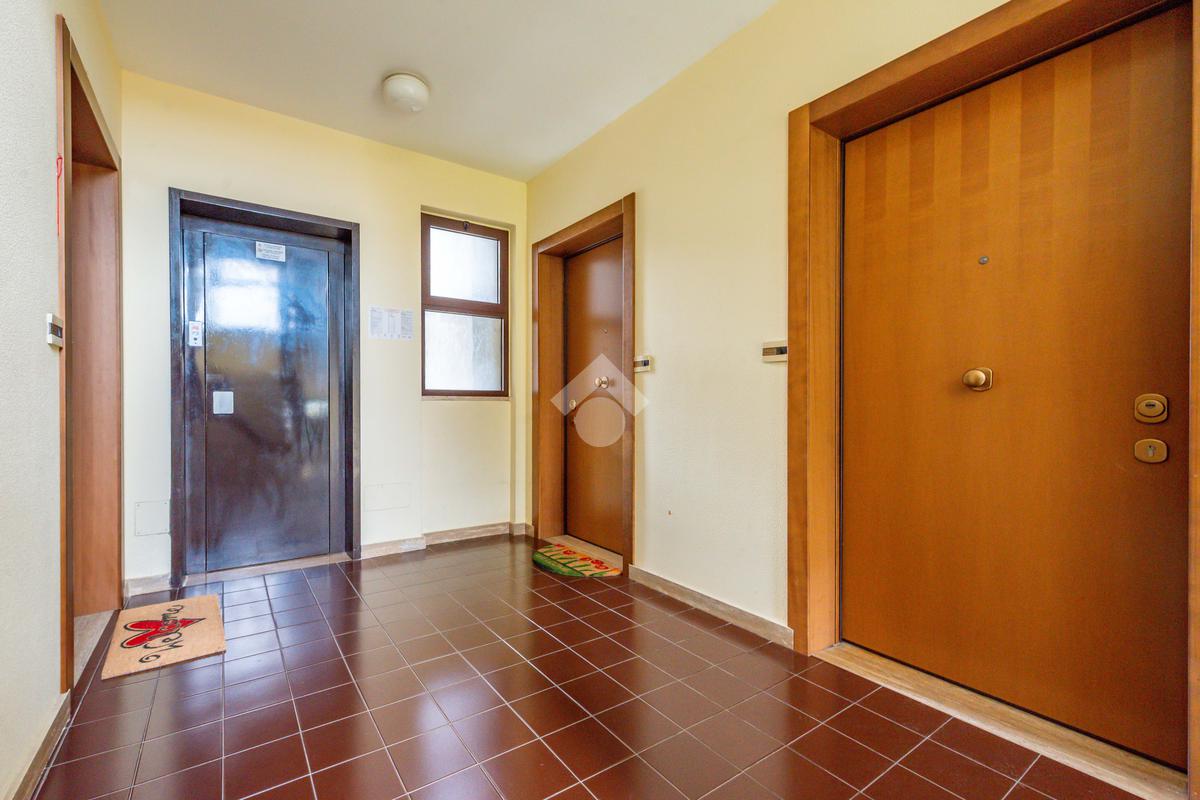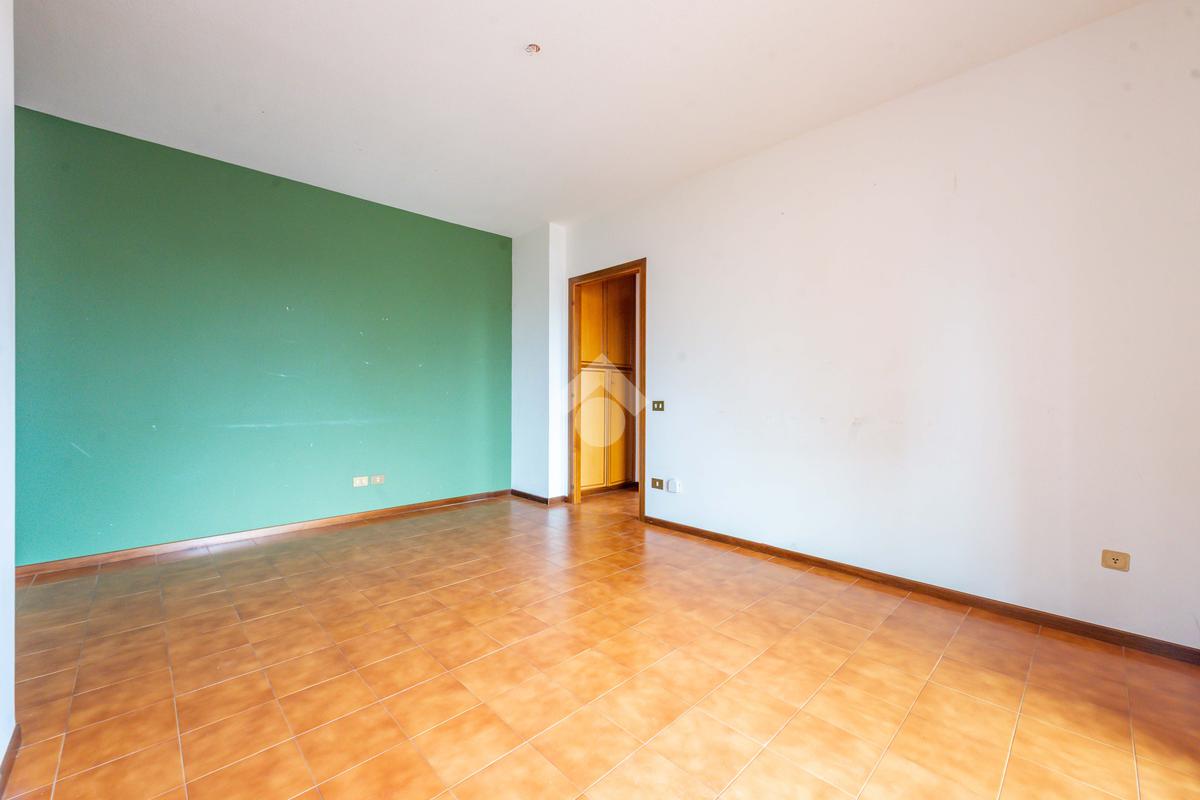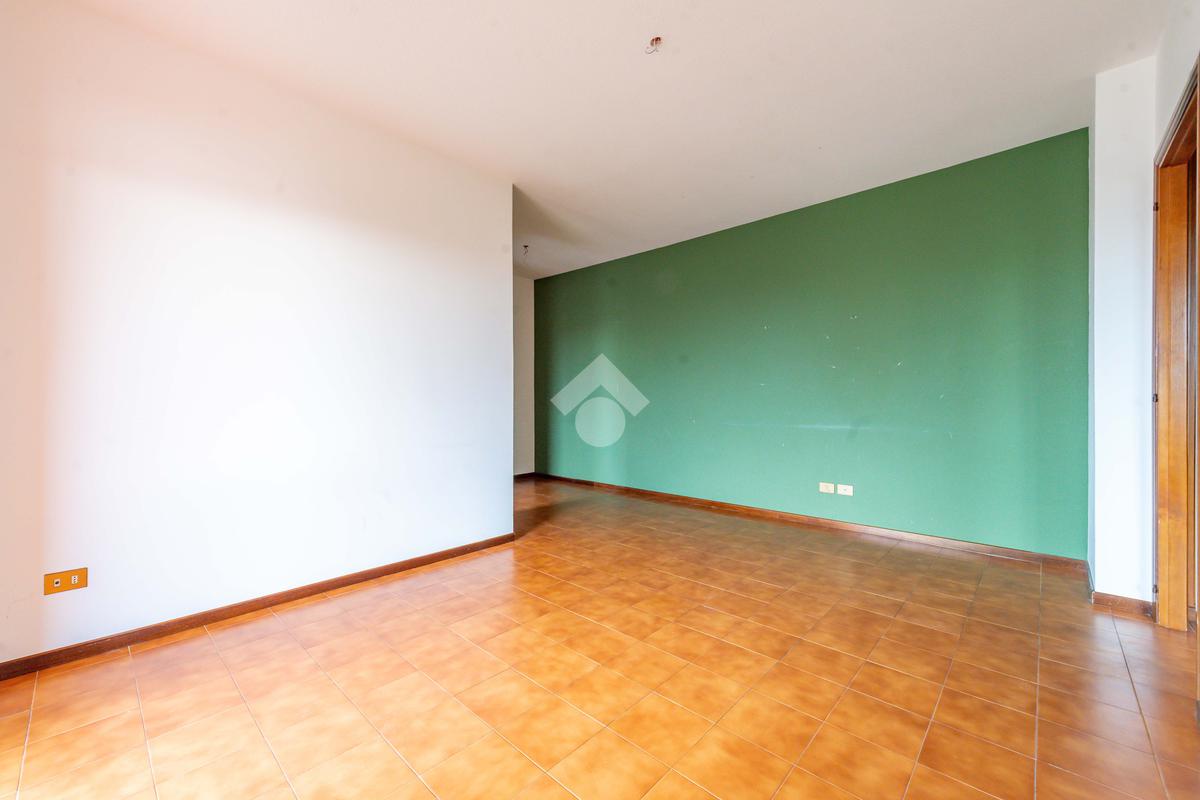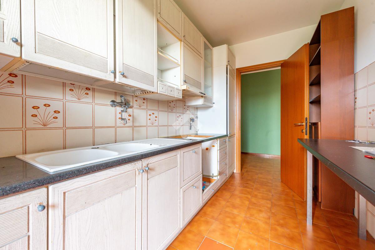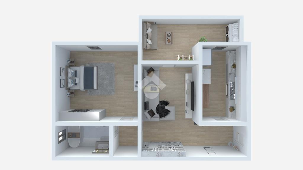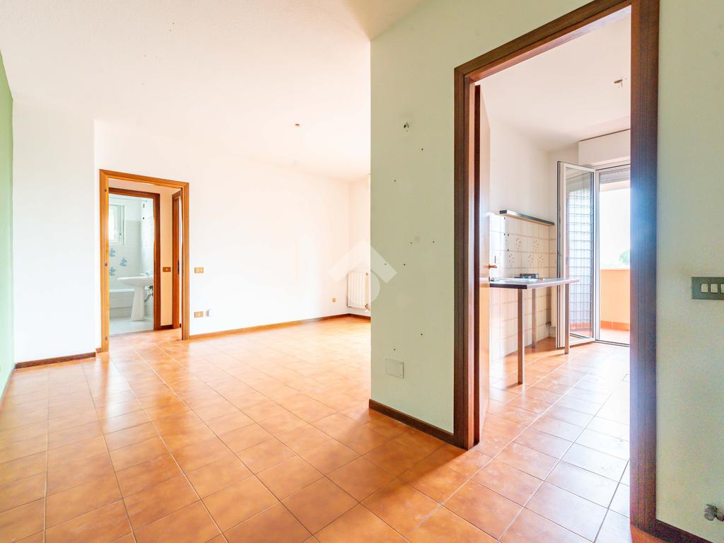 La zona notte, ben separata da un pratico disimpegno, comprende una camera matrimoniale e un bagno finestrato con box doccia. La presenza di armadi a muro sia nella camera che nel disimpegno garantisce ulteriore spazio contenitivo.